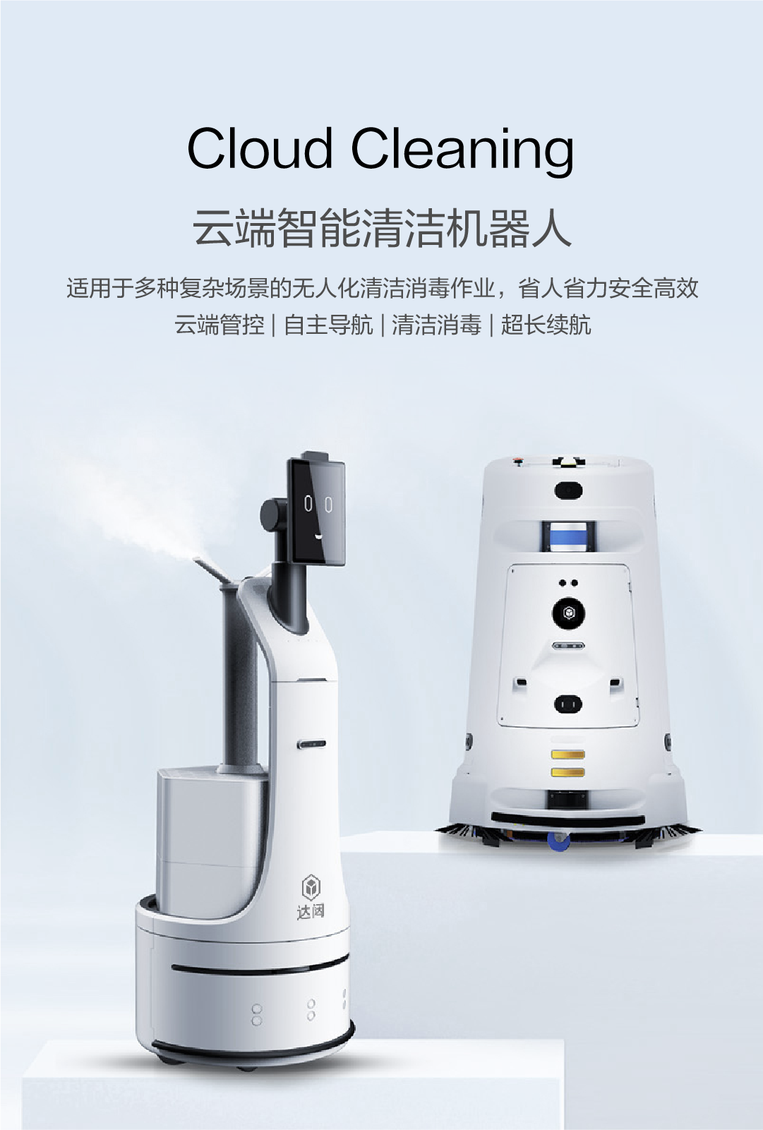 适用于多种复杂场景的无人化清洁消毒作业,省人省力安全高效 云端管控 | 自主导航 | 清洁消毒 | 超长续航